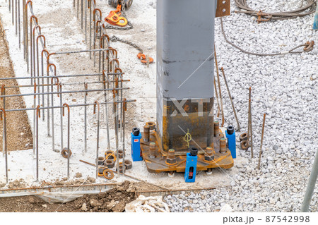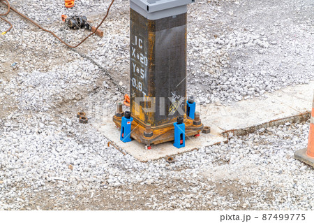 建設現場 鉄骨工事 柱脚 歪み直し 鉄骨柱建て方用レベル調整治具 工事現場