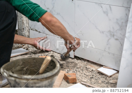 Male tiler using trowel laying marble tile with cement in bathroom. Housing development, improvement renovation