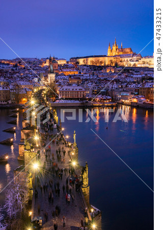 チェコ 雪化粧のプラハ カレル橋とプラハ城