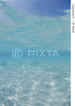 モルディブの浅瀬に泳ぐコバンアジと小島、青空