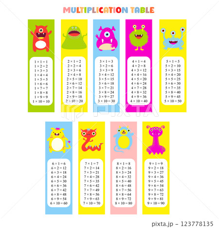 Multiplication table set. Collection of printable bookmarks or stickers with cute cartoon monsters. Collection of funny happy baby monster. Cute alien collection. Vector illustration EPS8
