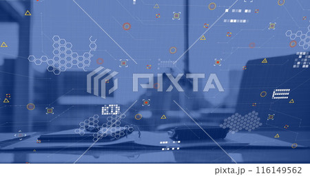 Image of financial data processing over empty office