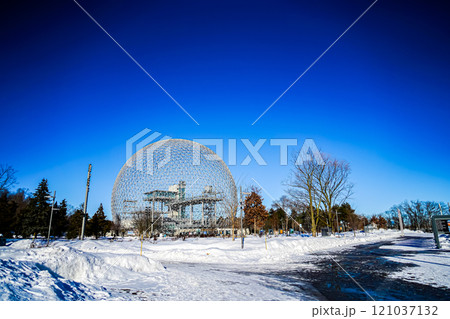 Montreal Biosphere illuminated at night. Jean-Drapeau park, Saint Helens Island. Montreal, Quebec, Canada.