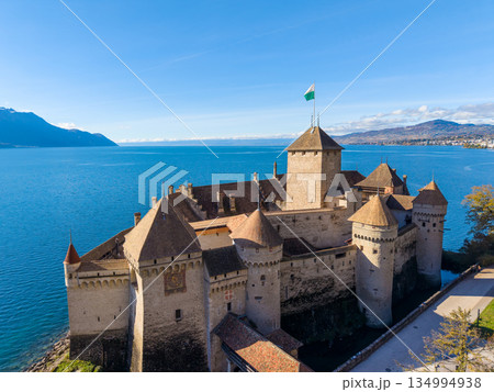 シヨン城とレマン湖の秋の風景の空撮。シヨン城、ヴォー州、スイス