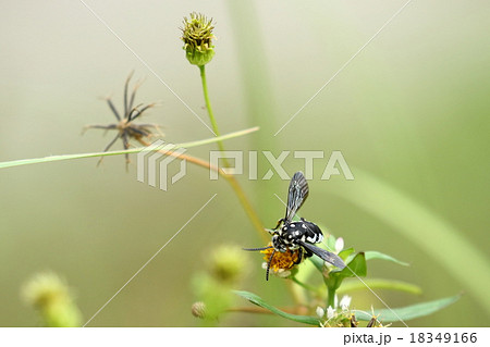生き物 昆虫 トモンハナバチ、背中の途切れた黄色の縞模様が特徴です