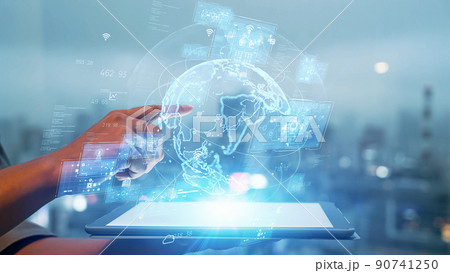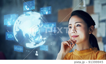 ホログラムの地球を見る外国人女性 グローバルネットワーク