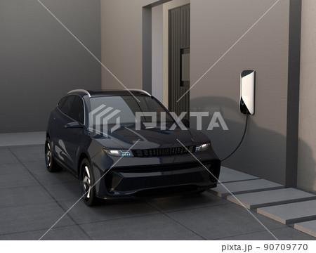 住宅ガレージに充電している黒色の電動SUV。