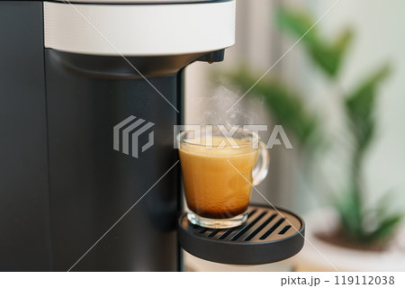 Fresh espresso at morning. Coffee machine in kitchen, close up. Modern coffee maker with freshly brewed coffee in glass cup. Kitchen appliances