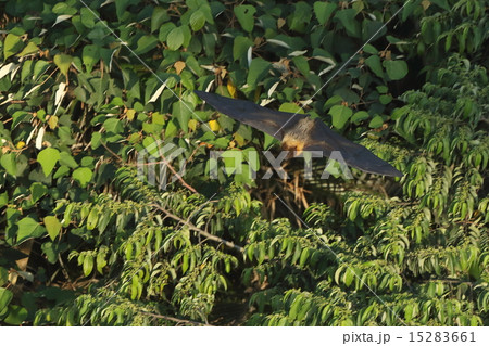 生き物 哺乳類 ヤエヤマオオコウモリ、日が高いのに林の上を飛行中。背中の毛の色がきれいです