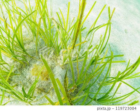 美しい海藻、アマモ(ミル科)とアカヤガラ(ヤガラ科)の幼魚。 神奈川県三浦市荒井浜 2024年6月