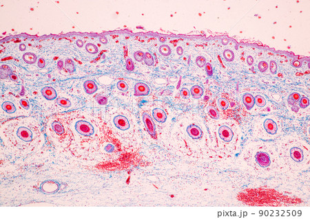 Scalp and hair follicles of human under the microscope in Lab.