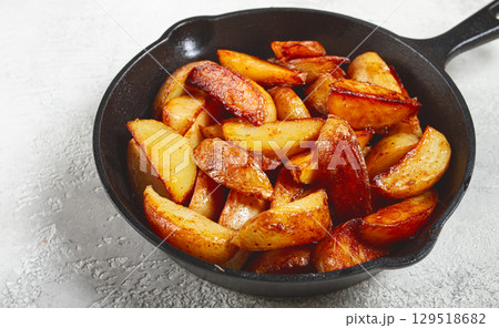 fried potato slices, in a cast-iron pan, homemade, no people,