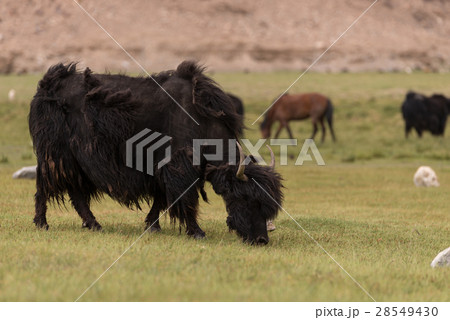 Yak grazing in meadow at Himalaya mountains. Dawn at Tso Moriri