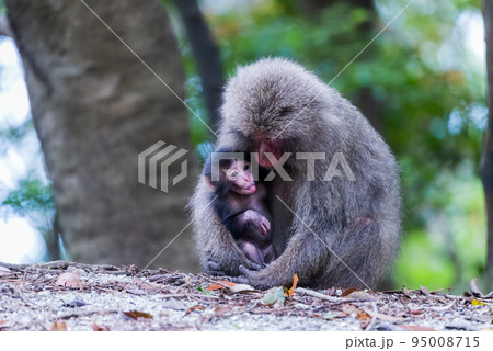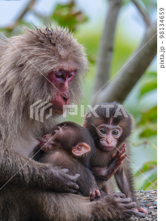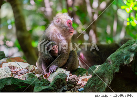 屋久島世界自然遺産の猿(5月)授乳中のヤクザルの親子