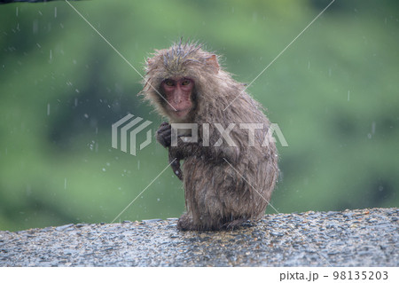 屋久島世界自然遺産の猿(6月)雨にじっと耐えるヤクザル