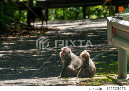 ヤクシマザルの群れ【12月】屋久島の道路に座るサル