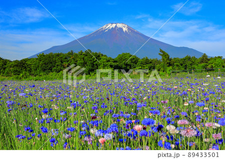 矢車菊咲く山中湖花の都公園から望む富士山