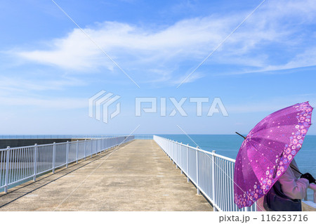 うららかな青空に映える道の駅海岸風景 (宇土市下網田町)「宇土マリーナおこしき館」