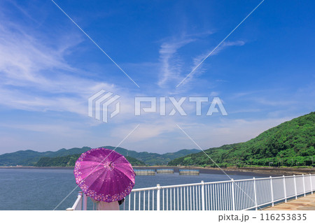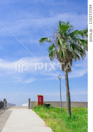 うららかな青空に映える道の駅海岸風景 (宇土市下網田町)「宇土マリーナおこしき館」
