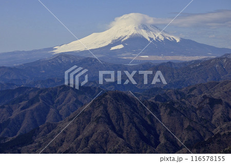 丹沢 熊笹ノ峰のヤタ尾根出合より望む厳冬の富士山と西丹沢