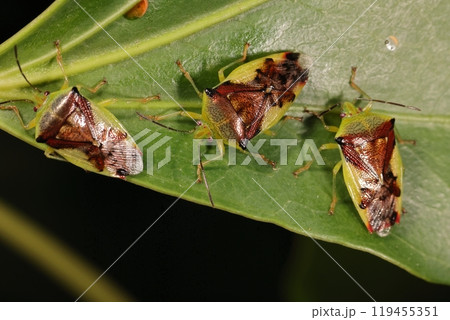 生き物 昆虫 アオモンツノカメムシ、十月の公園。カクレミノの木に幼虫や成虫が群れていました