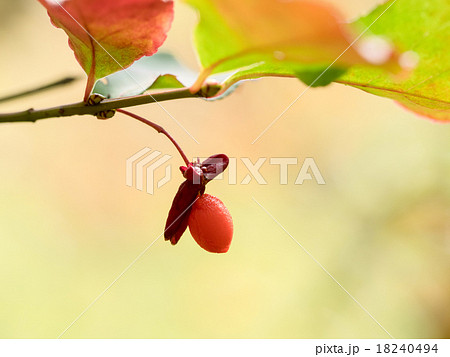 赤く色付いたニシキギの種子