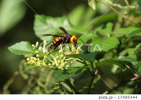 生き物 昆虫 オオスズメバチ、ヤブカラシで吸蜜中。食事に夢中で近づいても逃げません
