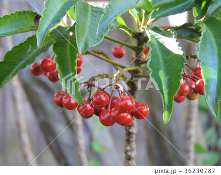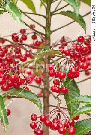 サクラソウ科の常緑低木 マンリョウの赤い実