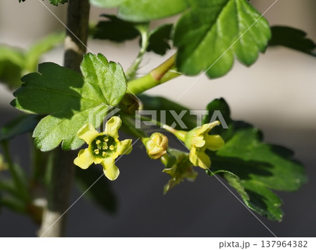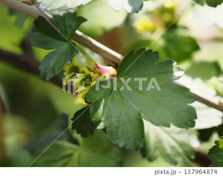 実はサンザシに似ているがスグリ科のヤブサンザシの黄色い花・クローズアップ