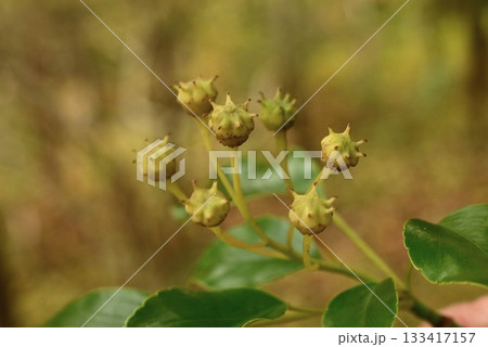 自然 植物 ヤマグルマ、初秋の未熟な果実。短い刺のある金平糖の様な実が枝先にすずなりです