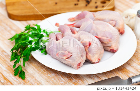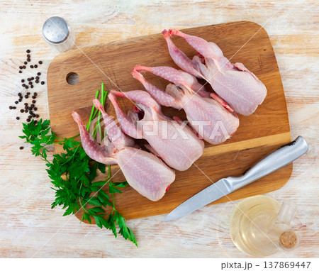 Young quails meat on white table on a wooden board, copy space