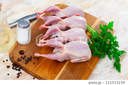 Raw gutted quails and condiments prepared for cooking on wooden table
