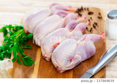 The chef prepares raw quail carcasses in the kitchen. Fresh raw meat quails ready for cooking on the wooden board
