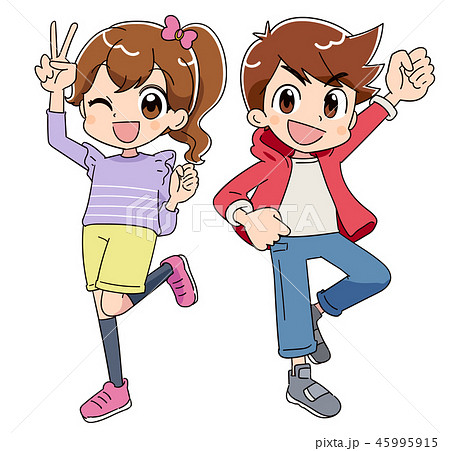 ガッツポーズをする探検服を着た子供達の全身イラスト