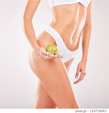 Skincare, apple and body of woman in lingerie in studio isolated on gray background mockup. Food, underwear and female model holding healthy fruit for diet, nutrition or vitamin c, wellness or beauty
