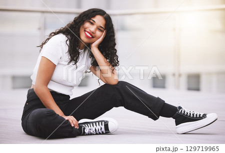 Fashion style and woman relax, sitting on a balcony with views of a city, relax outside and smile. Happy, carefree and trendy female, summer fun alone, enjoying fresh air and free time on weekend