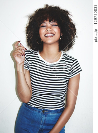 Student, gen z and portrait of natural black woman enjoying youth, happiness and confidence. Young, happy and smile of beautiful college girl with afro hair on white background in studio.