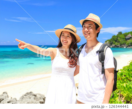 南国の美しいビーチと笑顔の若いカップル