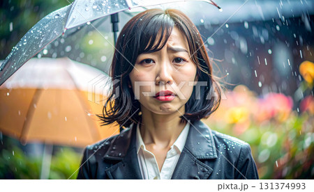 雨に打たれて悲しむビジネスウーマン(AI生成画像)