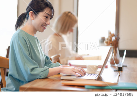 カフェでテレワークする女性と勉強する若い女性