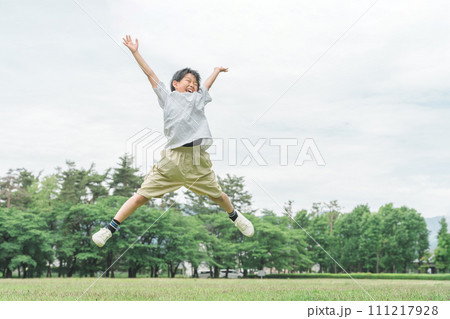 公園・キャンプ場でジャンプする小学生の男の子(ピクニック・キャンプ・アウトドア)