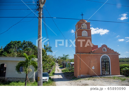 メキシコ ユカタン半島の田舎の町 オレンジ色の教会