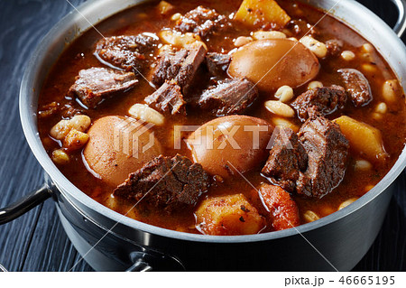 Vegetable beef stew with potato, green beans, carrot, peas and corn, in ceramic bowl, vertical
