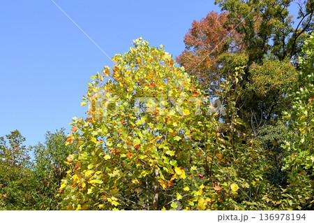 Colorful Autumn leaves on Liriodendron tulipifera tree, vibrant yellow, orange, and red tones highlighting seasonal nature beauty. Tulip Poplar tree illuminated by sunlight, creating vibrant canopy