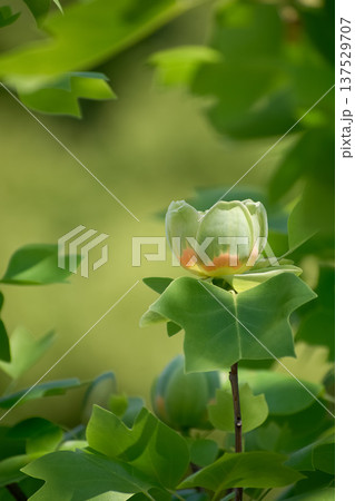黄色とオレンジ色の交じったユリノキの花(春、五月)