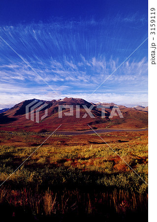 紅葉に染まるフォールド山の上に伸びる巻雲