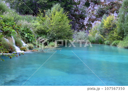 クロアチアの世界自然遺産プリトヴィッツェ湖群国立公園 下湖群の湖をつなぐ小滝と鮮やかなブルー