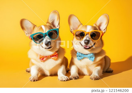 Two stylish corgis wearing colorful sunglasses and bow ties, posing together against a bright yellow background