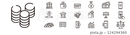 お金、金融、経済のアイコンのセット/ビジネス/通貨/貨幣/紙幣/銀行/貯金/現金/クレジットカード