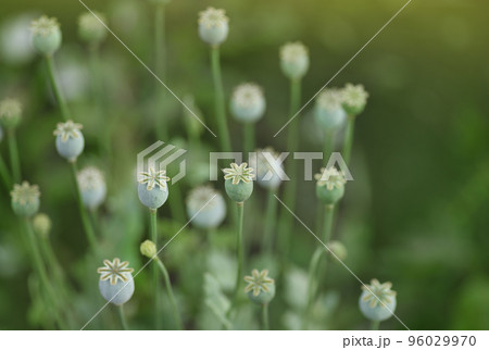 Summer field with green poppy seed boxes for nature background
